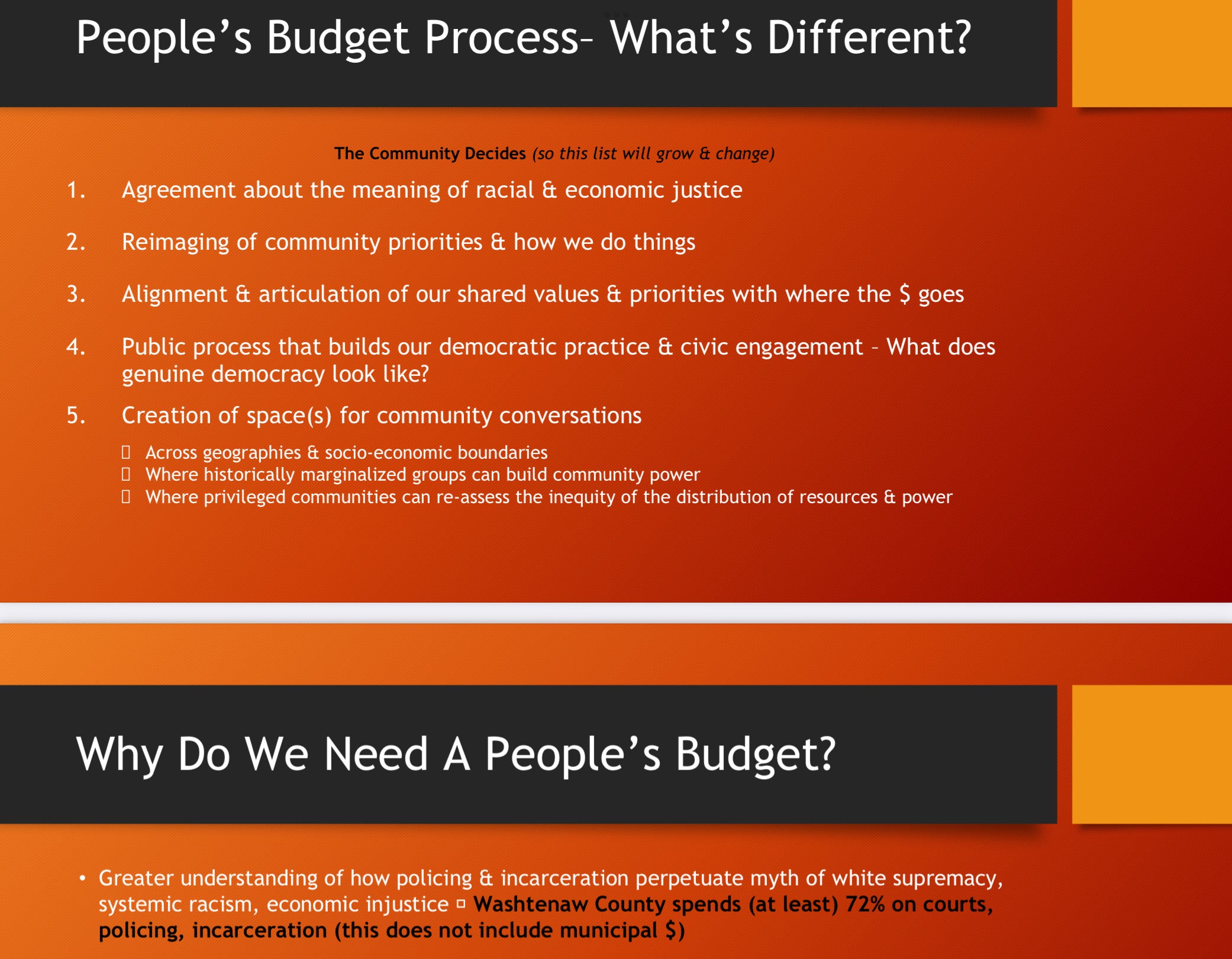 You might have heard that the Interfaith Council for Peace & Justice and a collaborative of Washtenaw County organizations and individuals are mobilizing an effort for greater resident participation in the budgeting process. Starting with the quadrennial budget, we want to raise the expectation of all in our community that residents should be actively involved in decision-making. We are particularly attuned to engaging those who have been historically marginalized from decision-making – Black, Indigenous, Latinx residents, youth, those who have been incarcerated, people who are unhoused, and workers who might not have time to sit through long public meetings.
