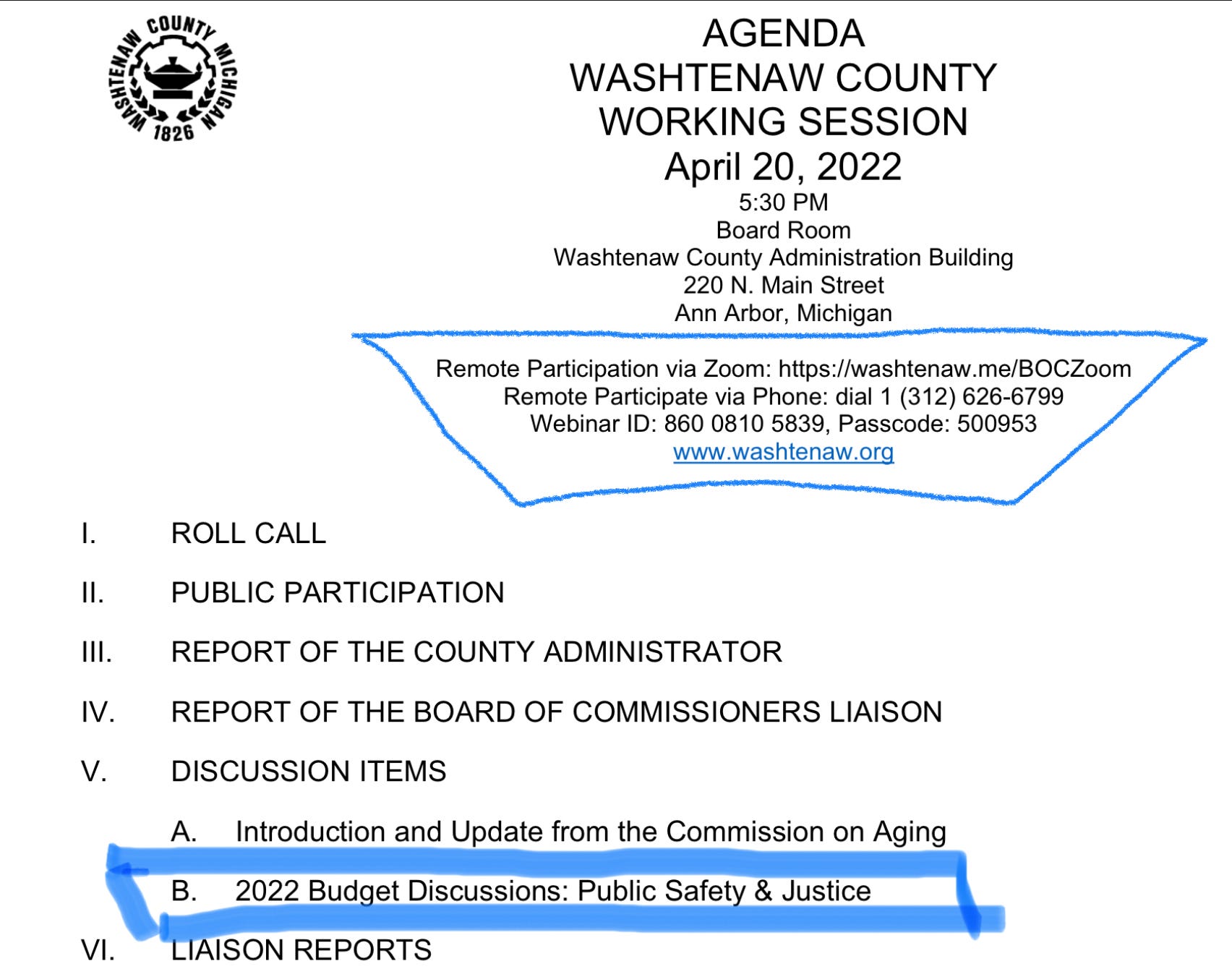 Wed 4/20 530pm Washtenaw County Sheriff Budget discussion. 1-minute public comment.
