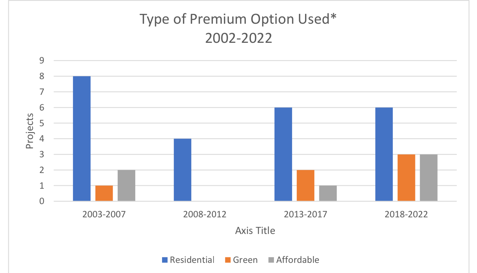 Unfortunately, when we look at the empirical data of the last 20 years of development history, we see very few instances of affordable housing premiums being used by developers.