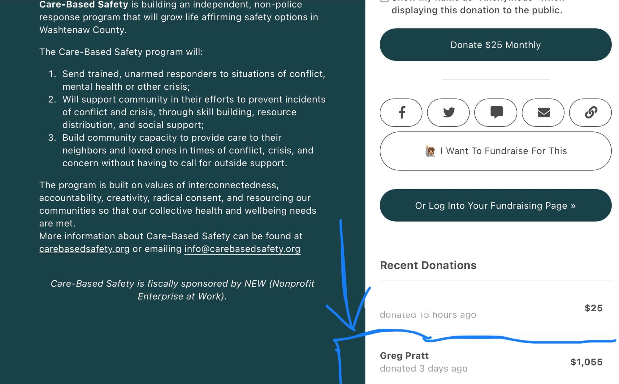 I had raised $1055 in 1.5 days on a gofundme fundraiser page. I have since donated the $1055 to Care-Based Safety [CBS], a local nonprofit agency focused on building unarmed crisis response and crisis prevention programs in Washtenaw County. CBS has recently been attempting to get unarmed crisis response programs up-and-running in Ann Arbor and Ypsilanti. You can donate to them by clicking >>>> here.