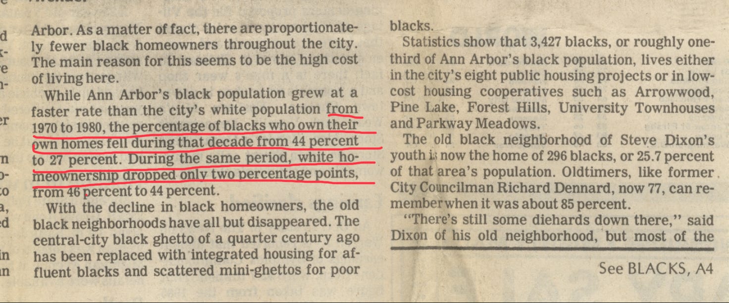 This is a screen cap of a portion of an Ann Arbor News article from 1986 about the dispossession/gentrification of black residents