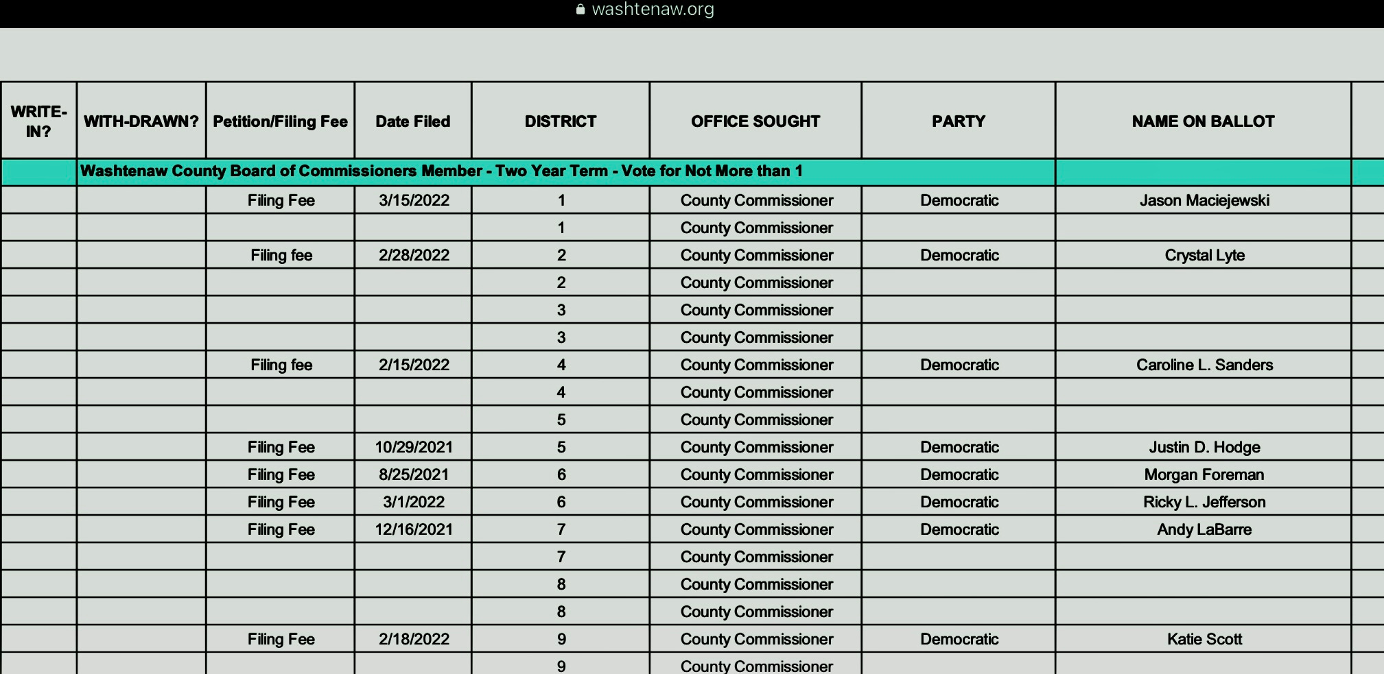 Others who’ve filed for re-election include longtime commissioner Andy LaBarre from Ann Arbor, who in part represents the geographic area known as East Ann Arbor. Jason Maciejewski is running again in District 1 which covers Chelsea and Scio Township. Katie Scott has thrown in again to represent District 9 on the west side of Ann Arbor. Sue Shink is running for state senate in another newly created district and Crystal Lyte, current Eastern Washtenaw County Democratic Party chair, looks to run in District 2 covering Whitmore Lake, much of Barton Hills and rural Webster Township.