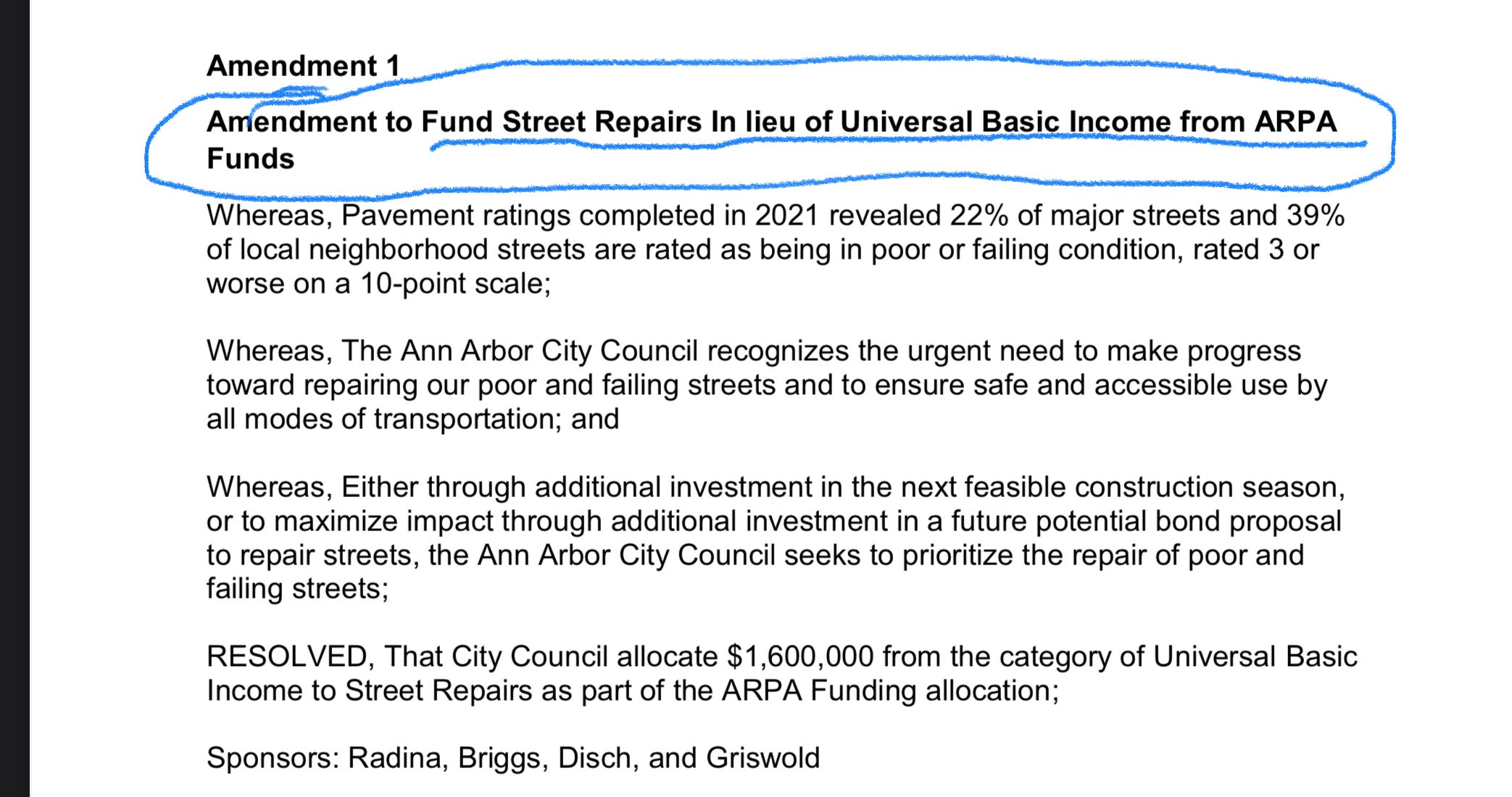 Last minute amendment to take $1.6M from #A2Council ARPA funds earmarked for UBI pilot to fill potholes