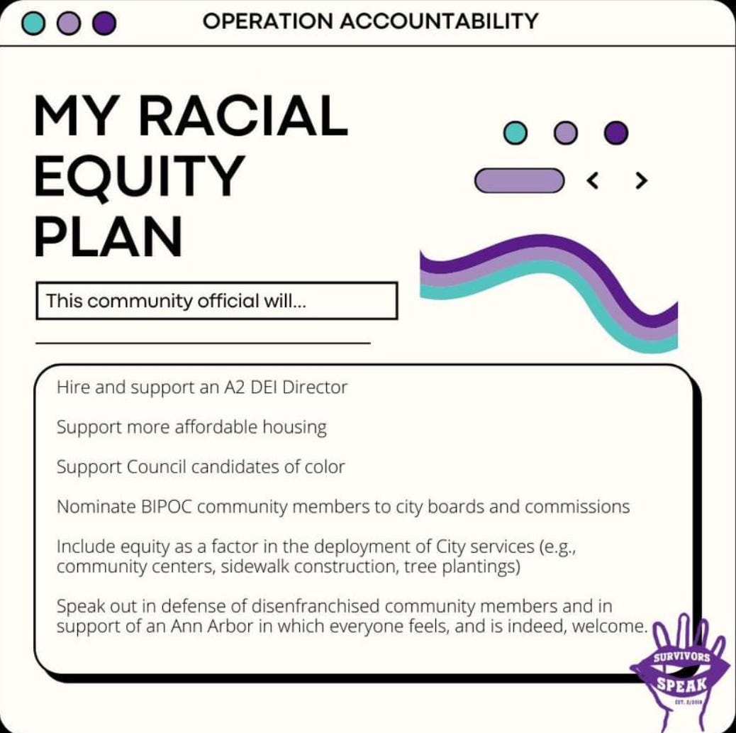 Survivors Speak is already on the case by following up with elected officials to ask them what is their racial equity plan for Ann Arbor. None of the current council members answered this query except for Taylor who had this to say: