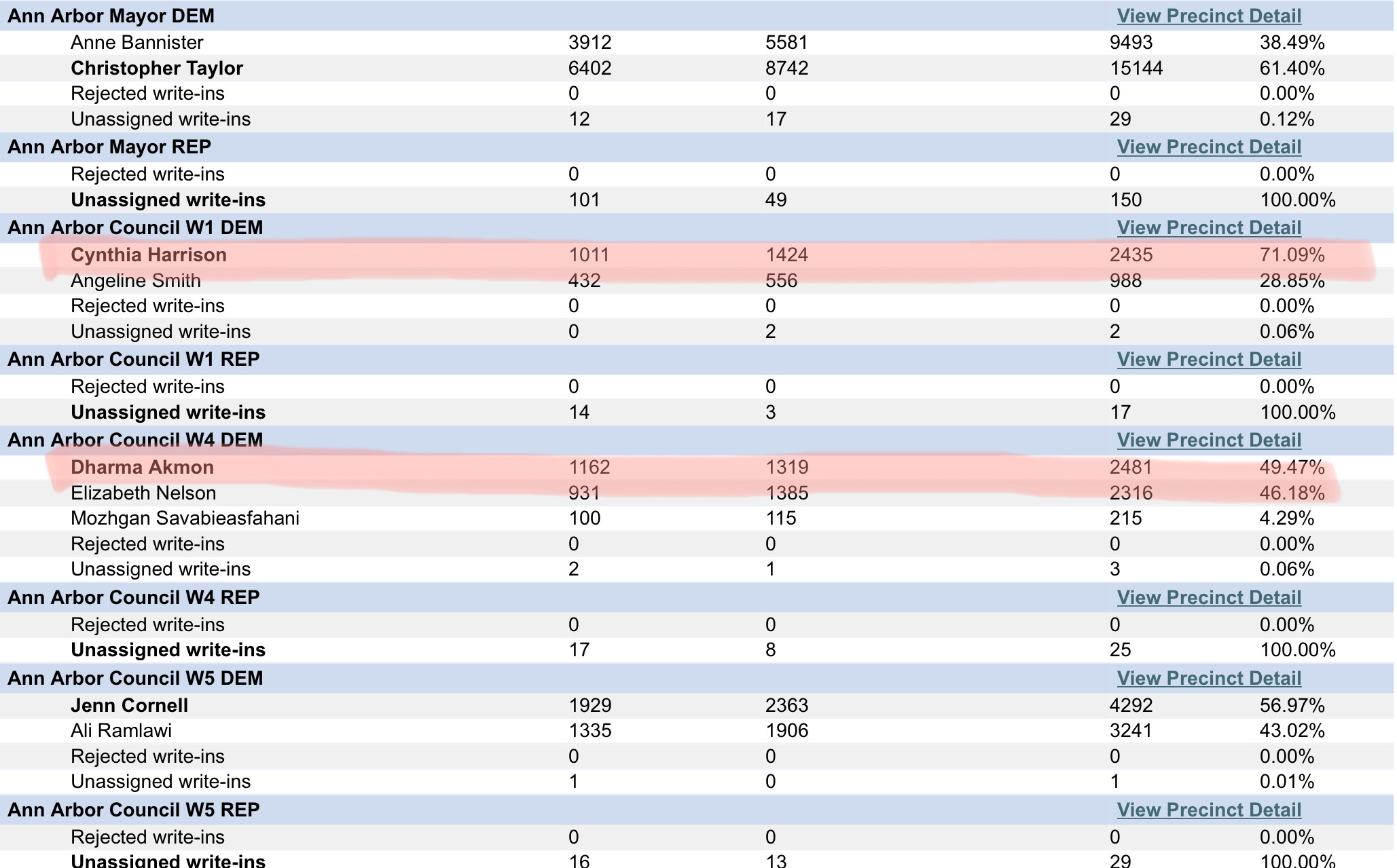 Note that Jenn Cornell beat out incumbent CM Ali Ramlawi in the mighty fifth ward [“mighty” as it is known to typically have the highest turnout of all wards in A2]. Let’s not forget the two unopposed Democratic Party candidates Ayesha Ghazi Edwin [Ward 3] and Chris Watson [Ward 2] who will appear on the ballot in November 2022.