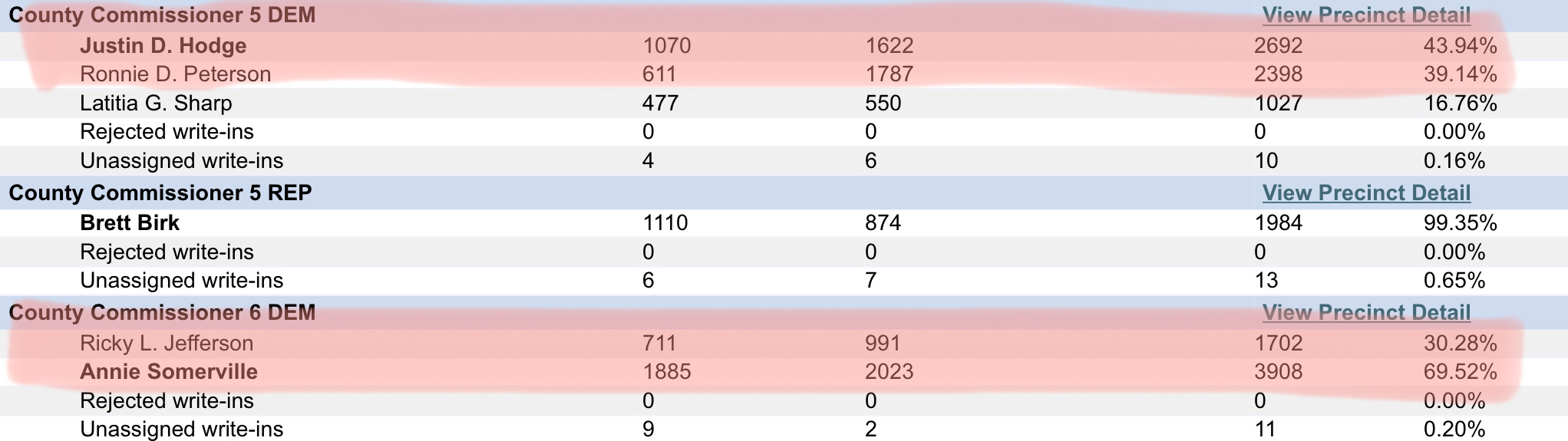 In County Commissioner races, District 5 incumbent Justin Hodge defeated challengers including former County Commissioner and current State Representative Ronnie Peterson. In District 6, Annie Someville [current Ypsi CM] beat out incumbent Ricky Jefferson.