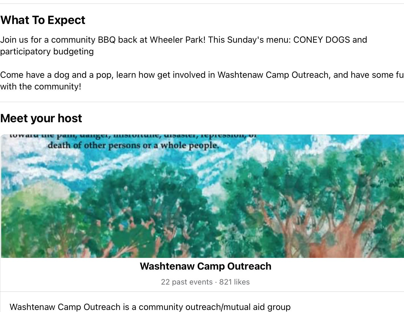 Washtenaw Camp Outreach BBQ 330pm Wheeler Park today Sunday June 12, 2022