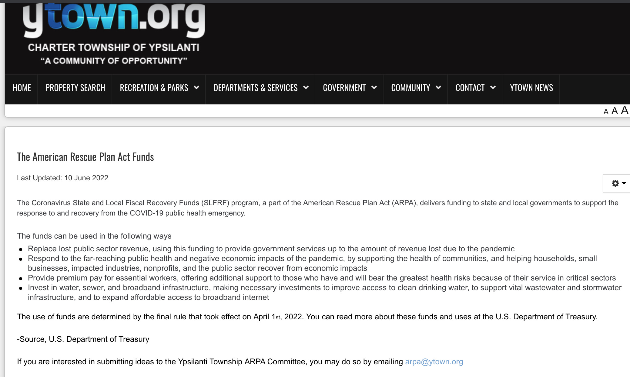 Go to this page for the Board of Trustees meeting agenda and minutes from the last previous meeting and below that the next one coming up. There is also a lot of info elsewhere on the ytown site. Spend a few minutes poking around if you like. We did and found this update on June 10 re: ARPA funds use: