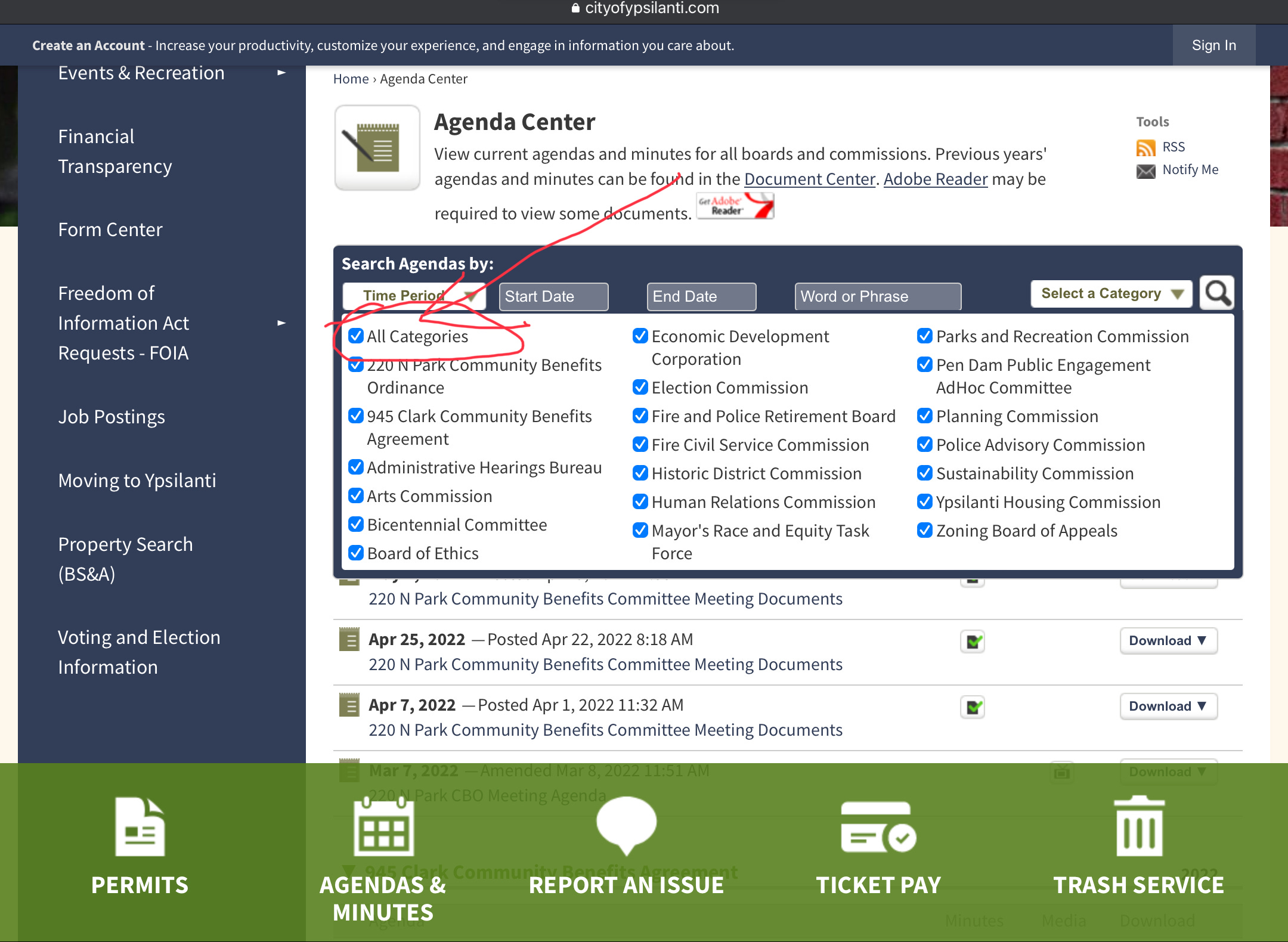 The first step to narrow down to one or how many board agendas you want to appear so click on the “Select a Category” drop down window. Then click on “All Categories” to uncheck and clear all agendas from the page.