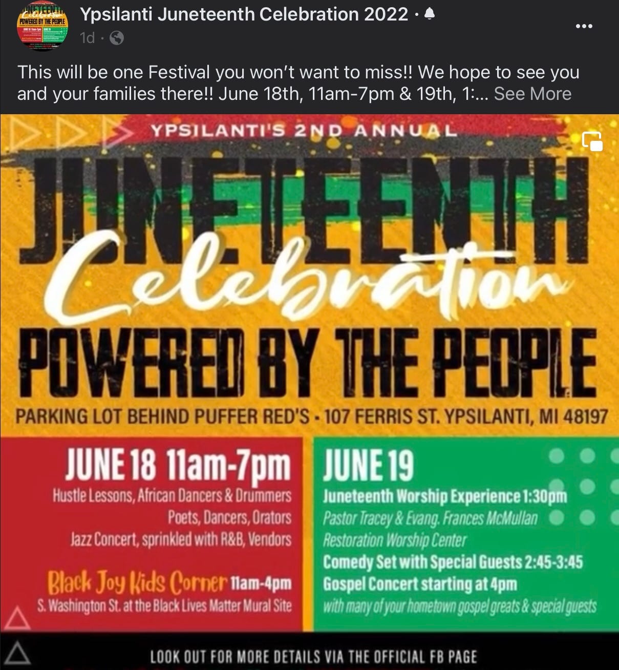 Here is a link to more info about the Ypsi Juneteenth Celebration June 18 & 19
