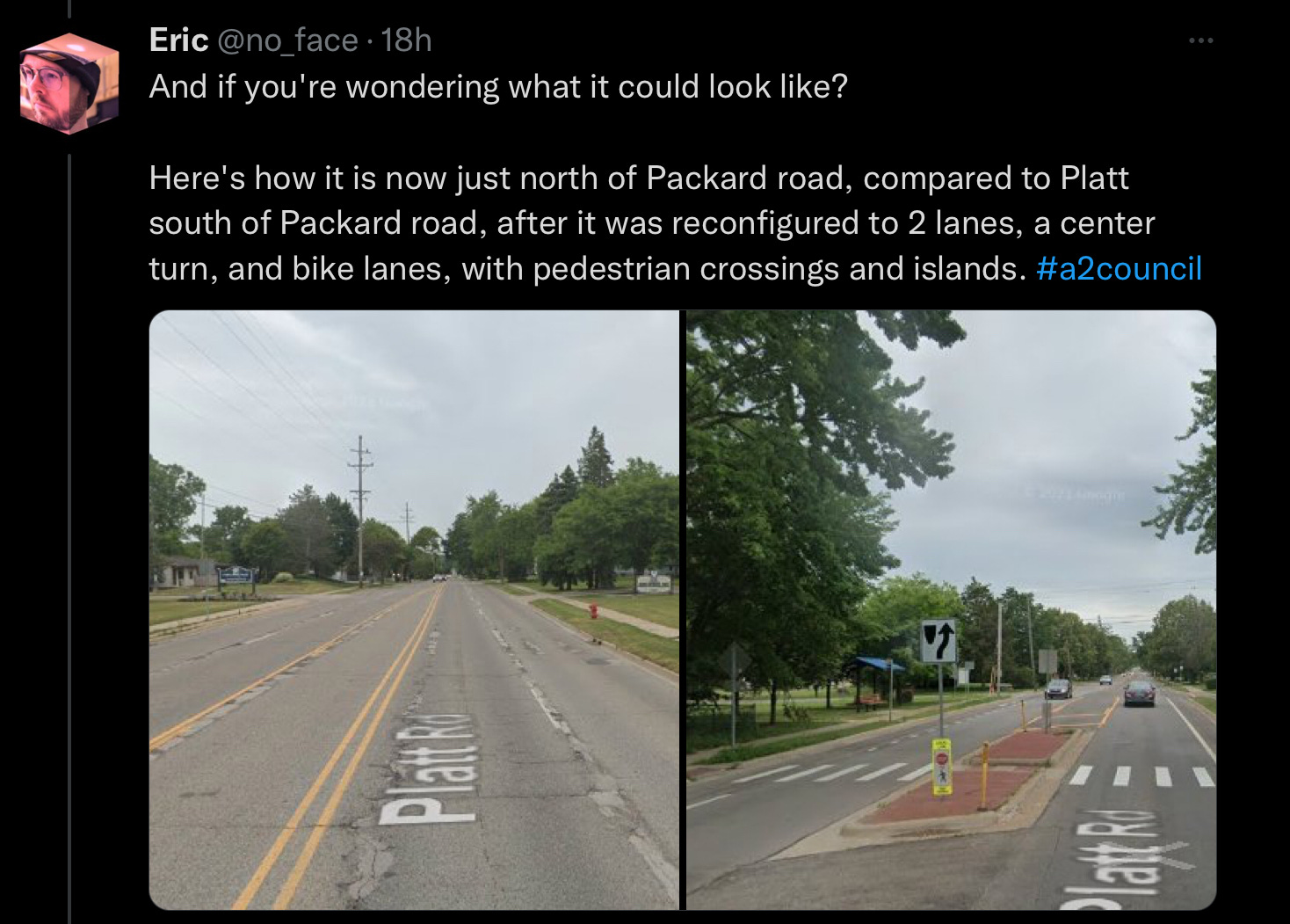 Fellow resident Eric posted a thread about item CA-7 Platt Road Improvements City-State Agreement. Start here if you would like to read the entire thread. Eric’s criticism is not so much the dollar amount but instead the likelihood that this is a once-in-a-generarion chance to redesign a poorly designed, car-centric “stroad” that lacks a significant amount of non-motorized transit infrastructure.