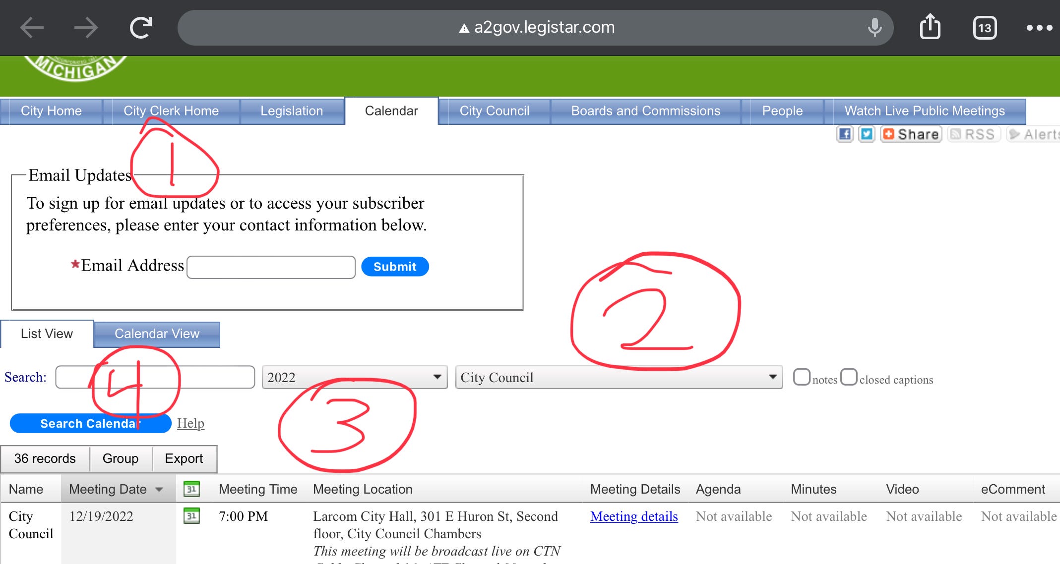 Take a look below for the above image noting the dropdown windows to find your city body and info for the particular meeting and/or agenda item in question.