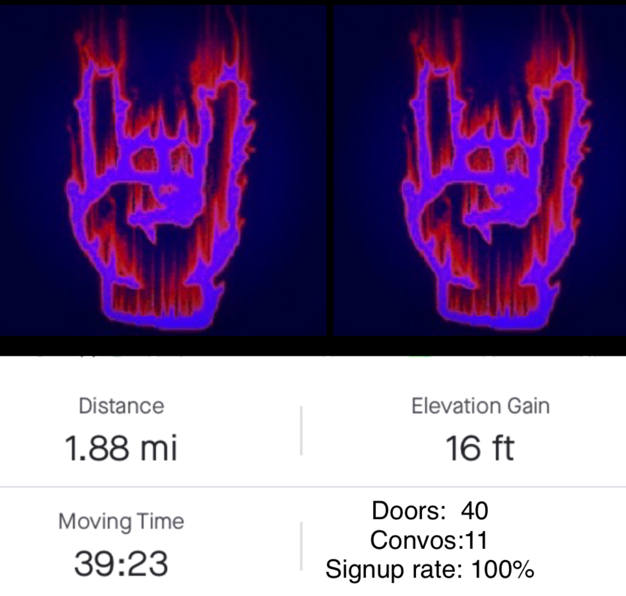 On Thursday, it was nice and sunny, only slightly brisk outside. I took my clipboard and headed out to ask folks to sign a nomination petition for one of the candidates I am supporting for city council this year. This time I had an assist. I was able to obtain a list and was only knocking doors of registered voters. I did this because in order for a petition signature to be valid, it needs to be a registered “elector” in the ward for which the candidate is running for council. So you can see when contrasting with the results I had last week, I walked less distance, hit more doors and got about the same number of petition signers.