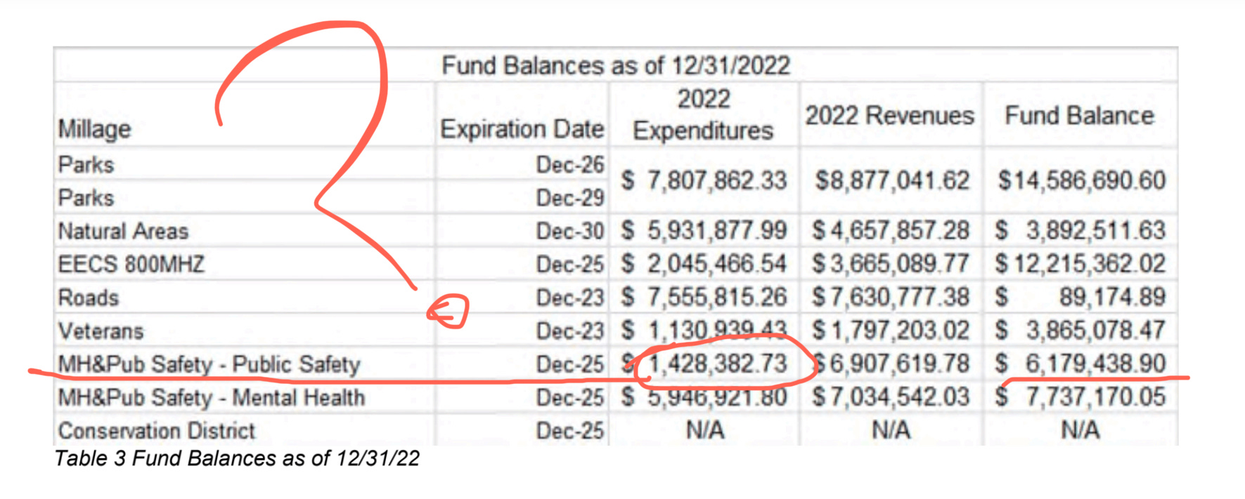 Care Based Safety, a local nonprofit organization dedicated to the creation of unarmed crisis response service programs in Washtenaw, issued a document prior to the March 6 BOC meetings which you can read here. The document doesn’t appear to have been updated yet, nevertheless it documents legitimate, detailed concerns many residents have about the current millage, what/ who is being funded and how the dollars are used by all recipients. Of particular concern are the $6M from the millage currently sitting in the WCSO portion of the fund balance. Looking at the 2023 county revenue white paper written by Administrator Greg Dill, he shows us that of the $6.9M the WCSO received from the millage in 2022, it only spent $1.4M, see image below and full report here. Washtenaw County Community Mental Health [CMH] is carrying a fund balance as well but receives a fraction of what the WCSO gets from our county general funds.