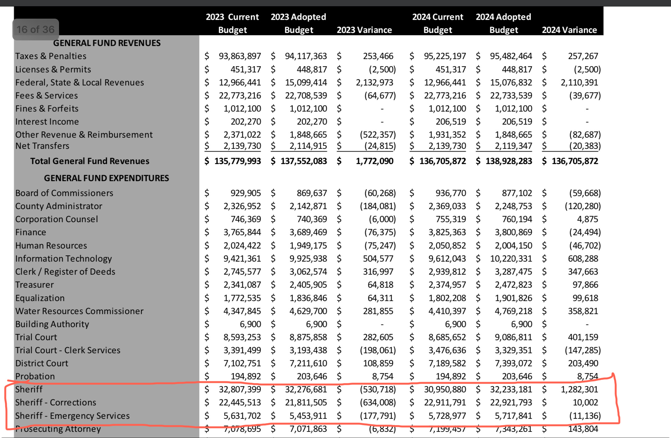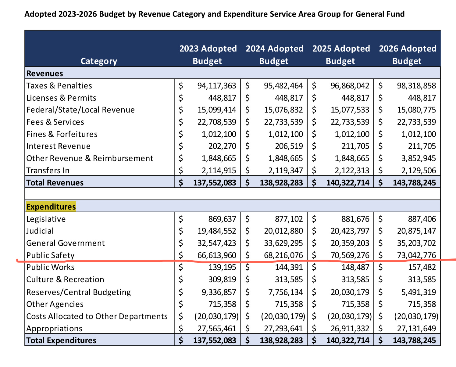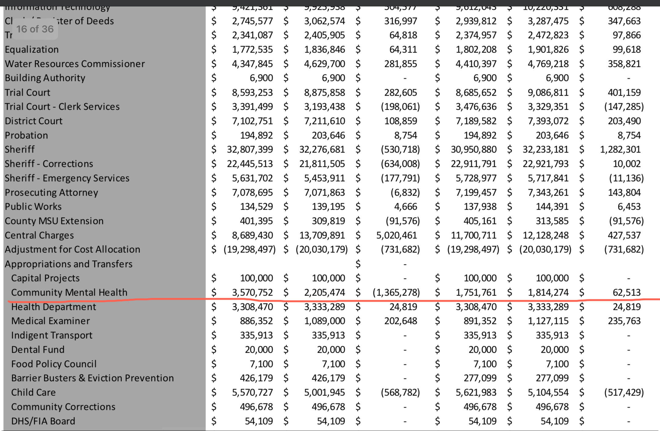 I think it warrants mentioning that the sheriff’s department is currently the largest recipient of general fund revenues, while our community mental health department receives a fraction of that. See the projected and annual adopted budget for 2023-2026 here and see images below for reference.