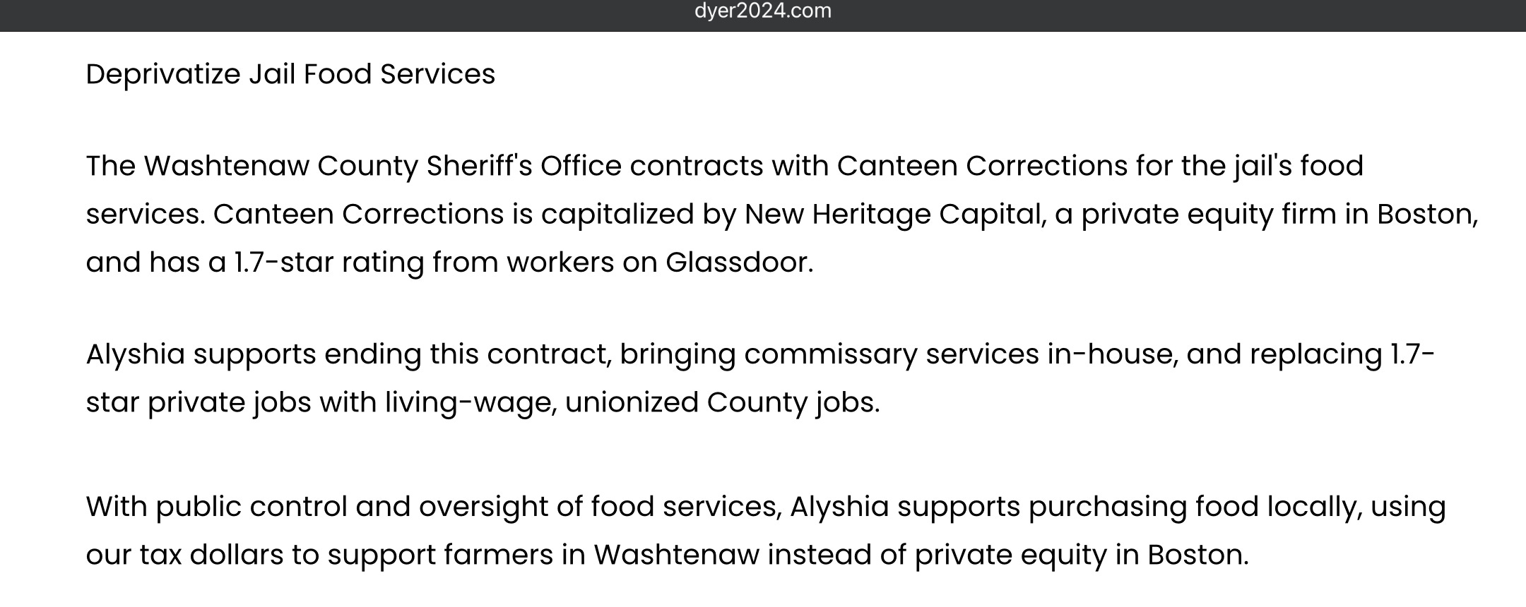 Where are these dollars going for jail “Store Commission” etc. Alyshia Dyer, Candidate for Sheriff in the August 2024 Democratic Primary supports “…bringing commissary services in-house, and replacing…private jobs with living-wage, unionized County jobs.” ««« click this link, scroll down and click on the “Reform the Washtenaw County Jail” drop down button.