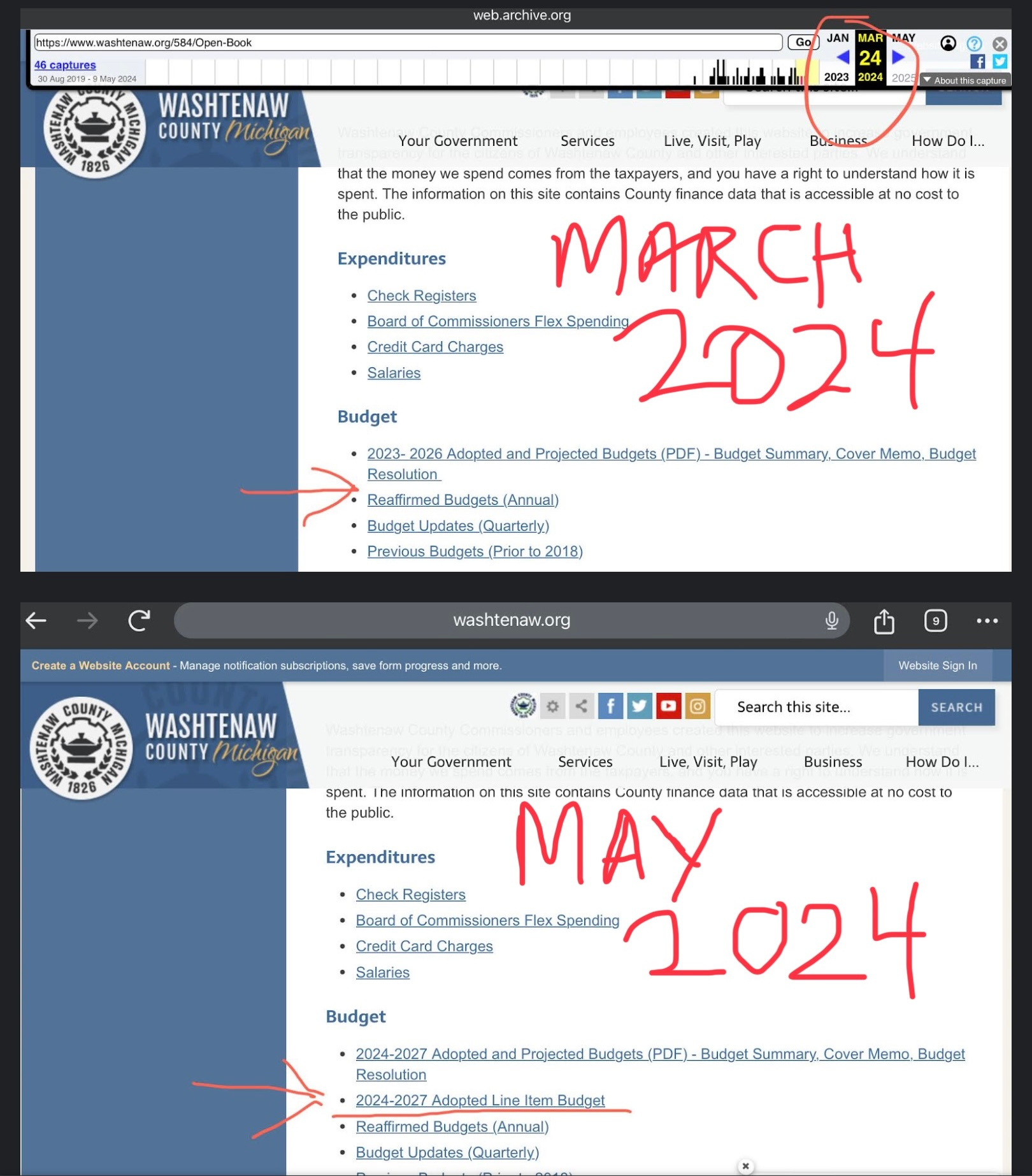 After being informed that the line item budget was available on the county Open Book webpage, I took a look via the Wayback Machine at the most recent archived Open Book webpage from March 2024, which shows that the line item budget was not on the page at that time.