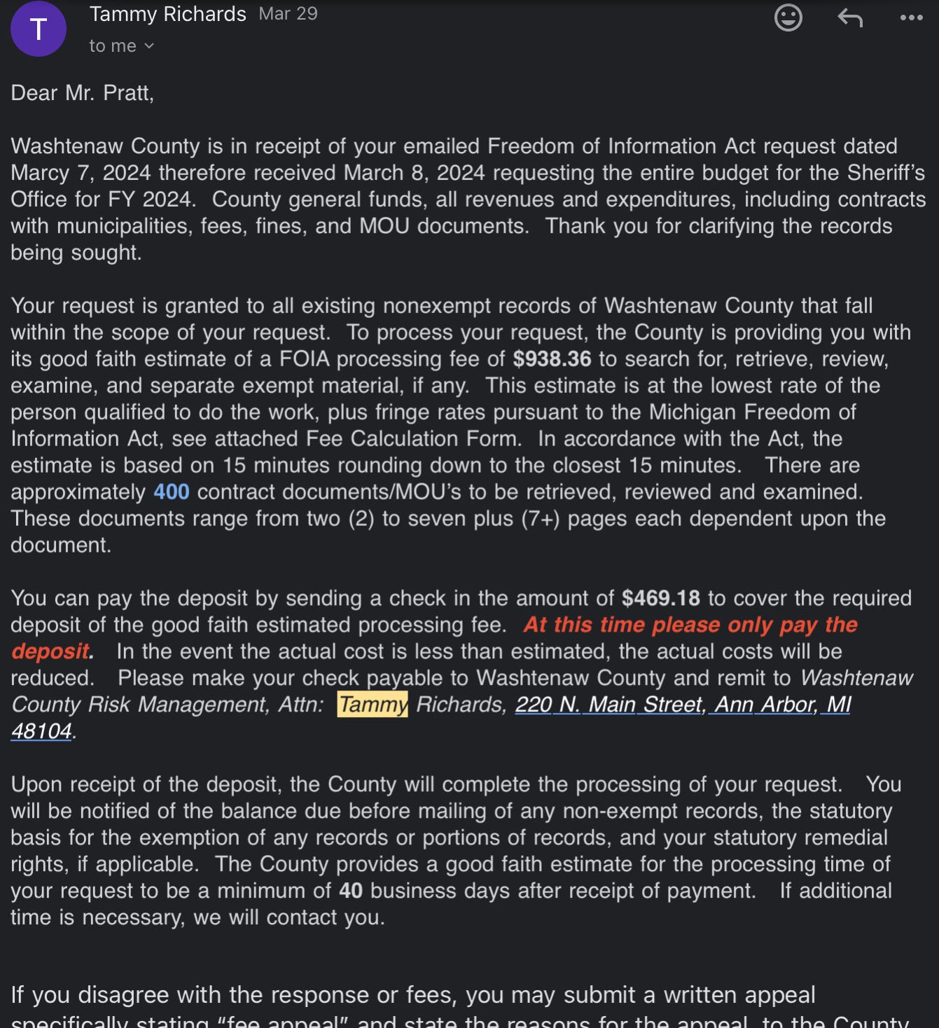 About a month ago, I submitted a FOIA for all of the county sheriff [WCSO] budget documents. The only ones I can find online note the revenues from the millage and general funds going to the WCSO, but no line items of the expenditures, how specifically those dollars are being used by the WCSO. The FOIA officer responded to my request on last Friday, stating that they can provide the documents I am requesting, but that I need to pay ~$938 in order for those documents to be sent to me.