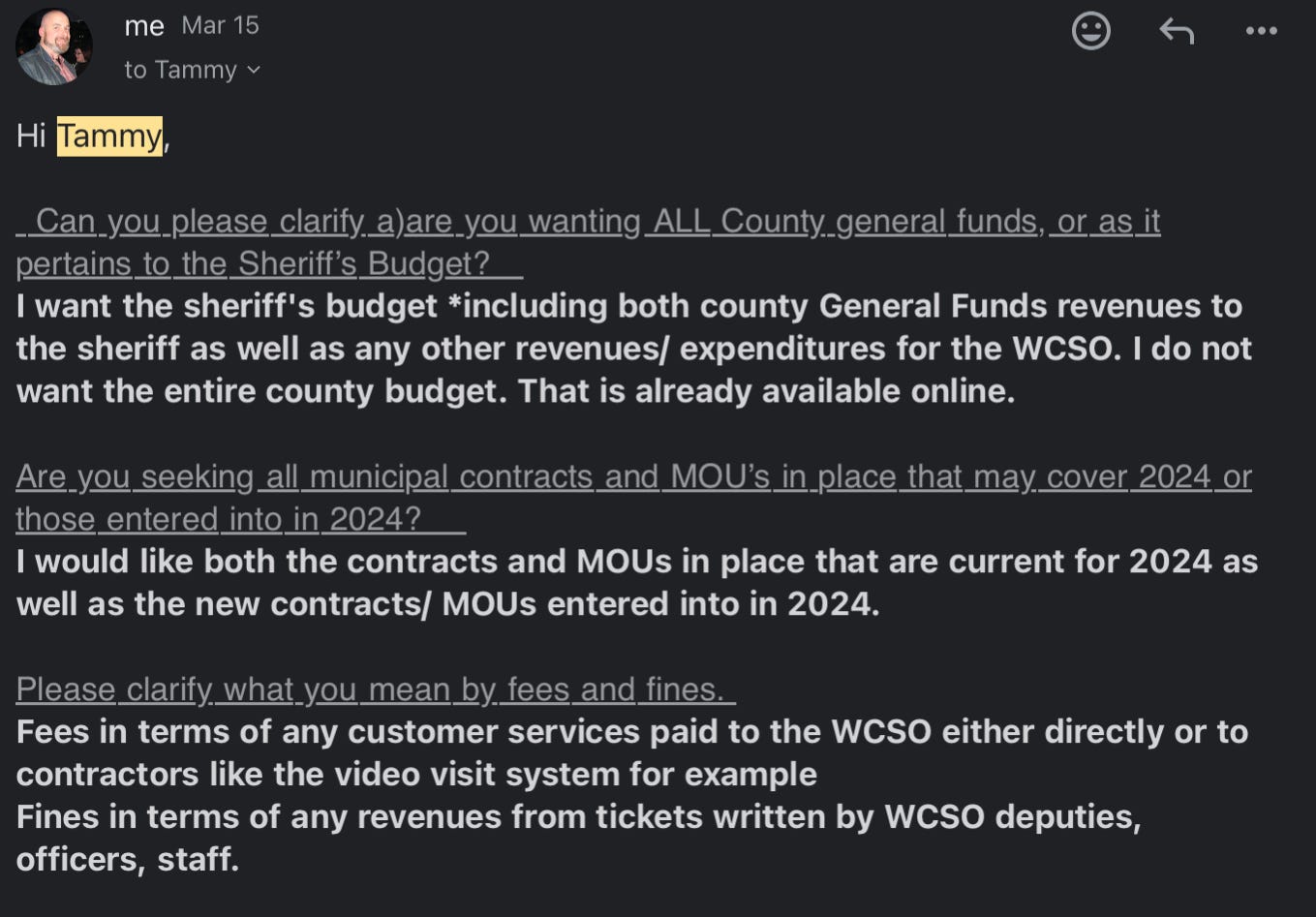Here are my responses to clarifying questions from Tammy the FOIA officer: