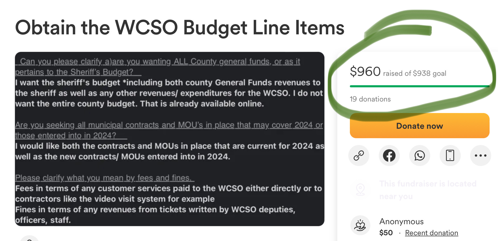 I submitted a FOIA request to the sheriff’s department [WCSO] for contracts/ MOUs and line-item revenues/ expenditures. The WCSO is asking for $938 to retrieve and send me the relevant documents. We were able to raise the funds last week [!!!]. Thanks to everyone who donated, shared the GoFundMe page. I’ll pay the deposit sometime today [it has to be a check] and the WCSO FOIA officer states that the request will take at minimum 40 days to process.