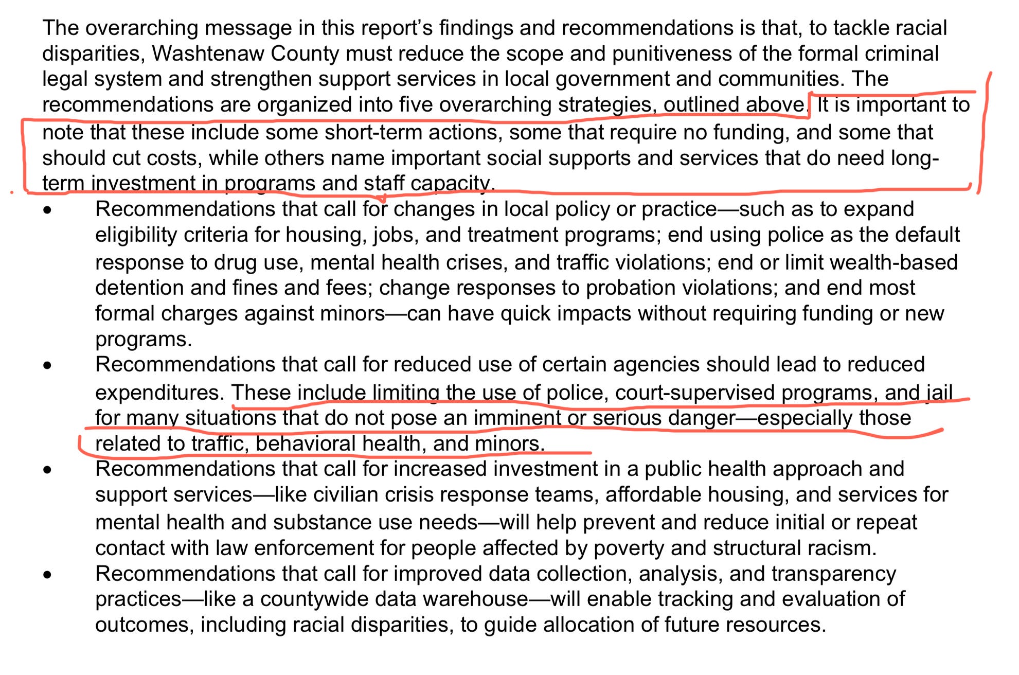 The Washtenaw Equity Partnership, a county government sponsored project, issued a report in 2023 with recommendations for a *public health* approach to public safety as well as a reduction in the resources going to the WCSO, policing and the carceral system which have disproportionate negative outcomes for Black residents, other persons of color and lower-income folks. Here is an excerpt from the executive summary of the report, which you can download from the link above: