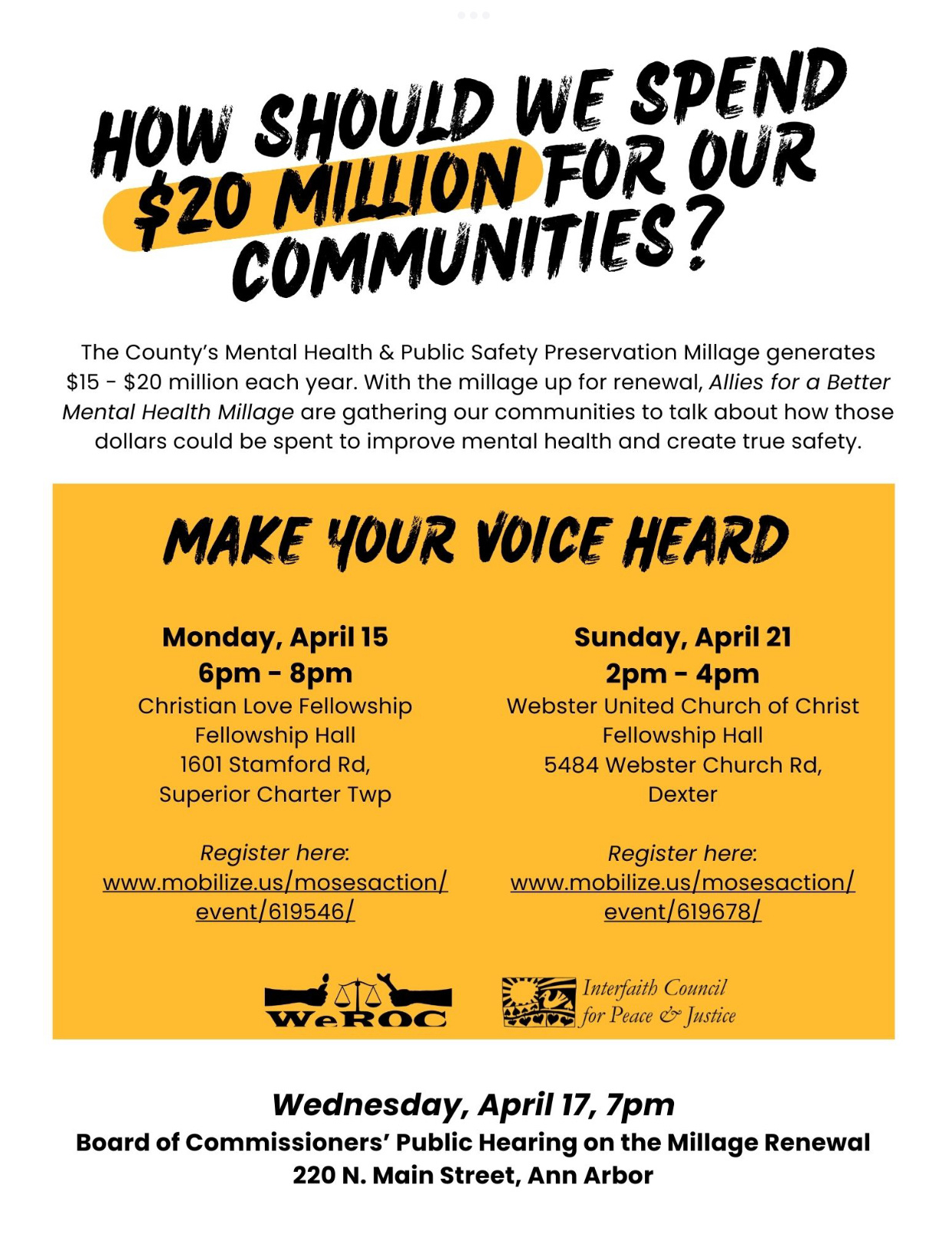 "We need the millage dollars to be used appropriately to support residents’ mental health," said Cynthia Bodewes, President of Washtenaw Regional Organizing Coalition and part of the Allies coalition. "The Commissioners have been invited to listen to residents’ concerns, and we need to have a great turnout in order to be effective in making sure that this important public decision truly improves our ability as a community to both improve mental health and public safety."